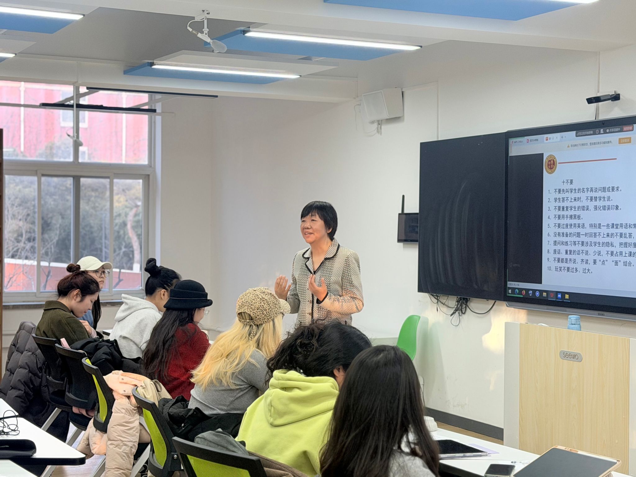 在第二部分,陈老师围绕中文课堂教学“十要十不要”与同学们交流,特别强调避免重复学生错误以防止强化错误印象。她指出,备课是教学成功的关键,教师需反复推敲教案,确保内容典型、标准且具交际价值,同时要消化吸收优秀教案,形成自身教学风格。课堂教学要遵循北语教学理念,精讲多练,让学生多说多练。